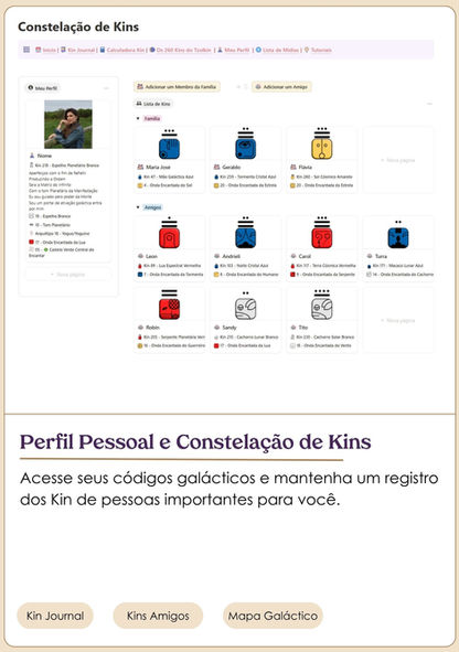Descubra seu Kin de nascimento, o Kin de amigos/família, e acompanhe os ciclos pessoais e coletivos.
